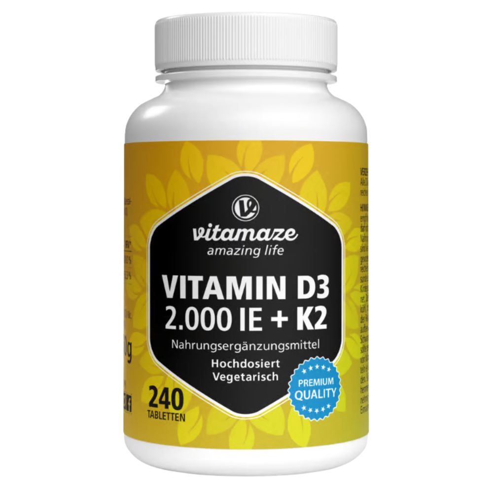 Vitamaze Vitamin D3 2.000 IE + K2 100 ”g bietet eine ausgewogene Option mit moderater Dosierung â hergestellt von einem vertrauenswĂŒrdigen deutschen Anbieter. Durch den vergleichsweise niedrigen Vitamin-D3-Gehalt eignet sich das PrĂ€parat weniger fĂŒr eine schnelle AuffĂŒllung eines Mangels oder fĂŒr Personen mit erhöhtem Bedarf. DafĂŒr ist es ideal fĂŒr alle, die eine sanfte, schrittweise Supplementierung bevorzugen und ihren Spiegel langfristig stabil halten möchten.