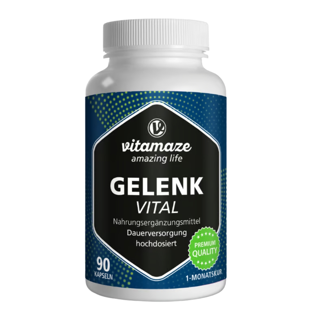 Vitamaze Gelenk Vital zählt zu den hochwertigsten und umfassendsten Formulierungen für die Gelenkgesundheit, die derzeit auf dem deutschen Markt erhältlich sind. Mit einem außergewöhnlich hohen Glucosamingehalt von 1.213,8 mg – kombiniert mit bewährten Inhaltsstoffen wie Chondroitin, MSM und Hyaluronsäure zur Unterstützung der Gelenkflüssigkeit – setzt dieses Produkt neue Maßstäbe und hebt sich deutlich von vergleichbaren Präparaten ab. Die Herstellung erfolgt ausschließlich in Deutschland nach strengen pharmazeutischen HACCP-Standards, gestützt auf jahrzehntelange Erfahrung in der Pharmaindustrie. So wird eine gleichbleibend hohe Qualität und Wirksamkeit gewährleistet. Dank der Clean-Label-Formulierung verzichtet Vitamaze vollständig auf unnötige Zusatzstoffe und bietet gleichzeitig eine optimale Bioverfügbarkeit – unterstützt durch kleine, leicht zu schluckende Kapseln.
