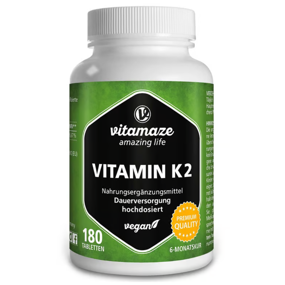 Das Vitamin K2 200 μg von Vitamaze überzeugt mit hoher Qualität, deutscher Herstellung und einer unkomplizierten MK-7-Dosis in Form einer preiswerten, langwirksamen Tablette. Ideal für alle, die ein einfaches K2-Präparat suchen. Allerdings bleibt die Formel aufgrund des Fehlens von Vitamin K1, MK-4 sowie wichtiger Co-Faktoren für eine bessere Bioverfügbarkeit hinter umfassenderen oder klinisch gestützten Produkten zurück.